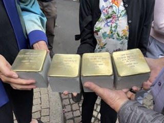 A sidenote about the cobblestones: During the Stolpersteine ceremony a public works person is there to remove small cobblestones and replace them with the Stolpersteine. It is tradition in the Jewish religion to place a stone on a grave when you visit it. Upon our return our families will be placing the removed cobblestones from in front of the house on the graves of my grandpa and his sister so they are back with a piece from their hometown.